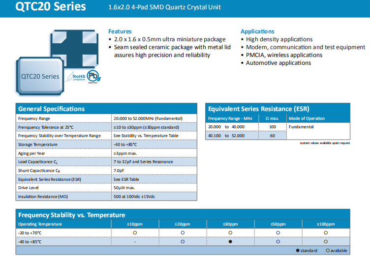 Quarztechnik晶振,QTC20晶振,進口無源晶振.普通石英晶振,外觀完全使用金屬材料封裝的,產(chǎn)品本身采用全自動石英晶體檢測儀,以及跌落,漏氣等苛刻實驗.產(chǎn)品本身具有高穩(wěn)定性,高可靠性的石英晶體諧振器,焊接方面支持表面貼裝,外觀采用金屬封裝,具有充分的密封性能,晶振本身能確保其高可靠性,采用編帶包裝,可對應(yīng)產(chǎn)品應(yīng)用到自動貼片機告訴安裝,滿足無鉛焊接的高溫回流溫度曲線要求.