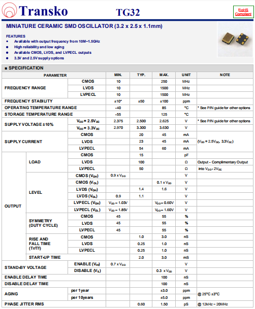 Transko晶振,TG32晶振,有源晶體振蕩器.貼片式石英晶體振蕩器,低電壓?jiǎn)?dòng)功率,并且有多種電壓供選擇,比如有1.8V,2.5V,3.3V,3.8V,5V等,產(chǎn)品被廣泛應(yīng)用于,平板筆記本,GPS系統(tǒng),光纖通道,千兆以太網(wǎng),串行ATA,串行連接SCSI,PCI-Express的SDH / SONET發(fā)射基站等領(lǐng)域.符合RoHS/無(wú)鉛.