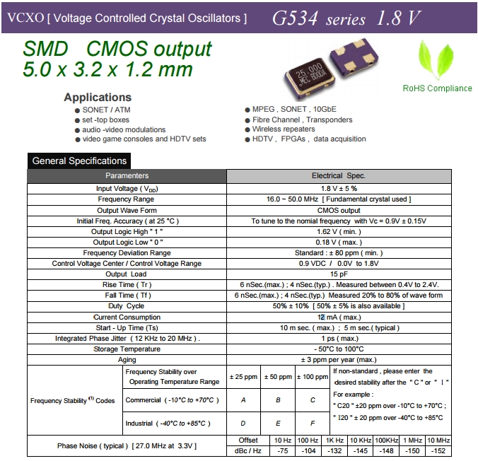 MERCURY晶振,壓控晶振,G534晶振,瑪居禮有源晶體振蕩器.VCXO是指這款晶體產(chǎn)品控制功能只有單壓控也就是電壓控制功能,產(chǎn)品本身頻率精度可以隨著電壓搞定起伏來自動調(diào)整頻率,使產(chǎn)品永遠控制在一定的頻率范圍,壓控晶振(VCXO)壓控石英晶體振蕩器基本解決方案,PECL輸出,輸出頻率60 MHz到200 MHz之間,出色的低相位噪聲和抖動,三態(tài)功能,應用:SDH/ SONET,以太網(wǎng),基站,筆記本晶振應用, VCXO,壓控晶體應用:調(diào)制解調(diào)器,ADSL網(wǎng)絡控制器,無線基站,程控交換設(shè)備智能手機,筆記本晶振等.