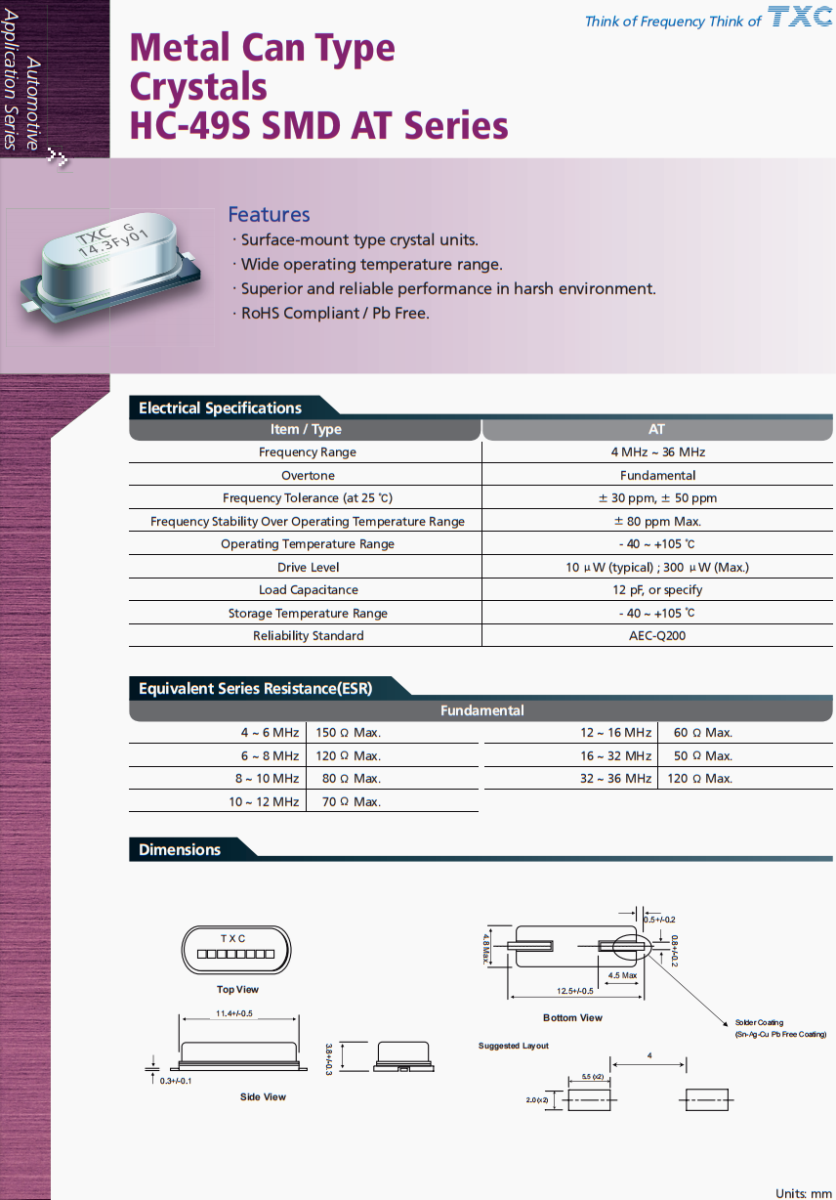 臺灣晶技晶振,車載多媒體晶振,AT-4.9152MDGE-T晶振,臺灣TXC晶振公司,晶技晶振,臺灣晶振,進口晶振,石英晶振,四腳晶振,AT-20.500MDHQ-T晶振,貼片晶振,無源晶振,網絡設備晶振,汽車晶振,高品質晶振,汽車氛圍燈晶振,大燈控制器晶振,小尺寸晶振,耐高溫晶振,金屬罐型,晶體, AT系列HC-49S SMD,特征,表面貼裝型晶體單元。工作溫度范圍寬。·惡劣環境下性能優越可靠。符合RoHS標準/無鉛。